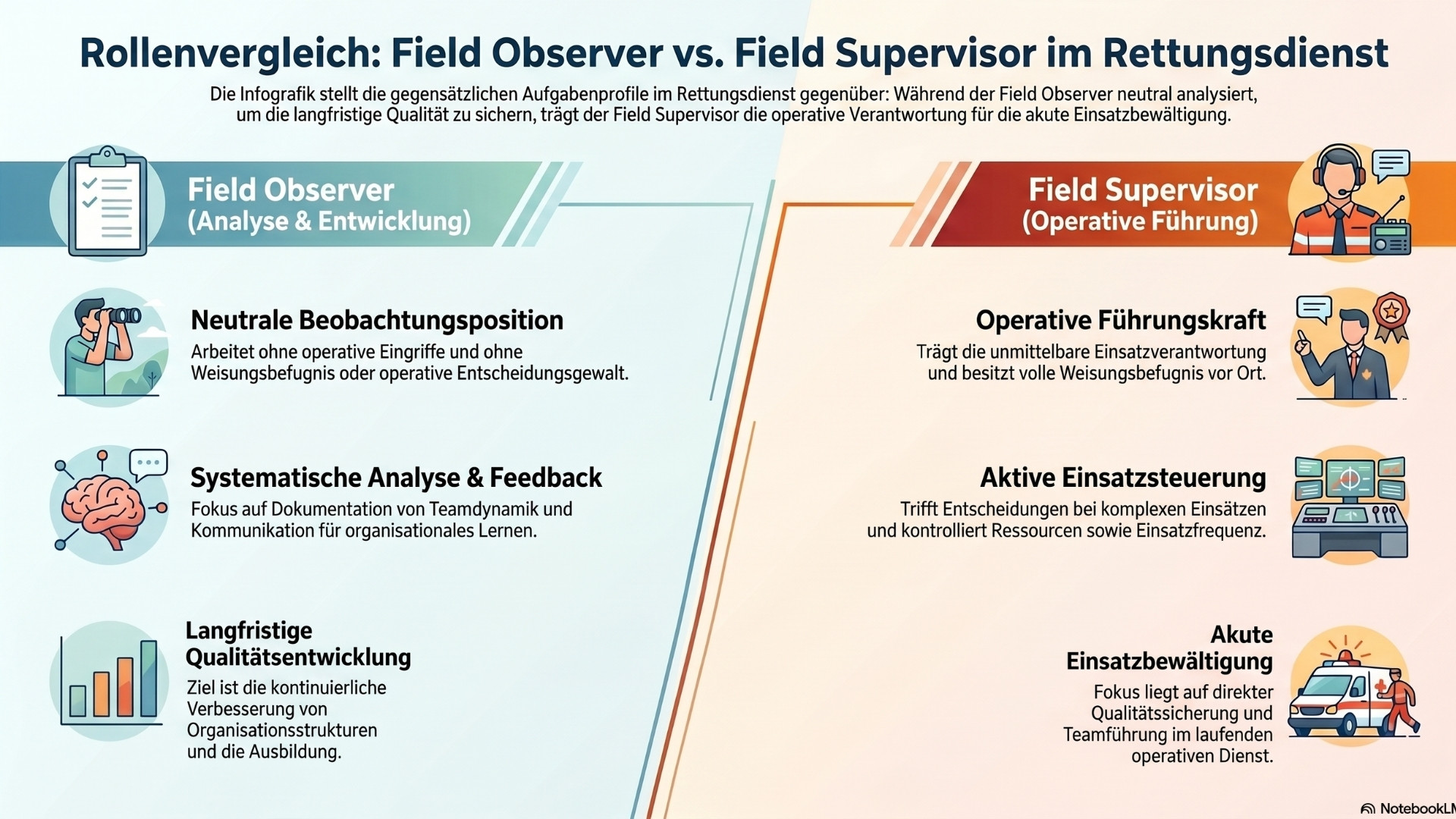 Der Field Supervisor arbeitet operativ im Einsatz, trifft Entscheidungen und führt Teams. Der EMS Field Observer greift nicht ein, sondern analysiert Abläufe und Strukturen, um langfristige Verbesserungen im System zu ermöglichen.
